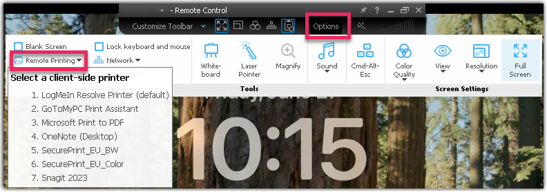 - En haut de la fenêtre de contrôle à distance, sélectionnez Options dans la barre d'outils noire.