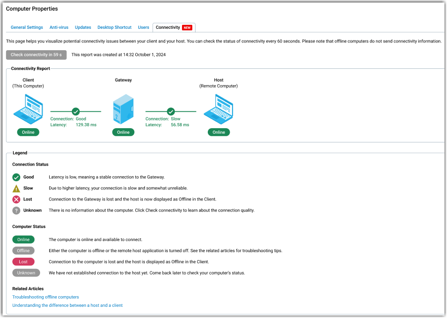 Important: Le diagramme de connexion fournit des informations sur les hôtes en ligne uniquement. Les ordinateurs hors ligne n'envoient pas d'informations de connexion à la passerelle. Si votre ordinateur s'affiche comme étant hors ligne, consultez les conseils de dépannage dans Dépannage des ordinateurs hors ligne en LogMeIn Pro.