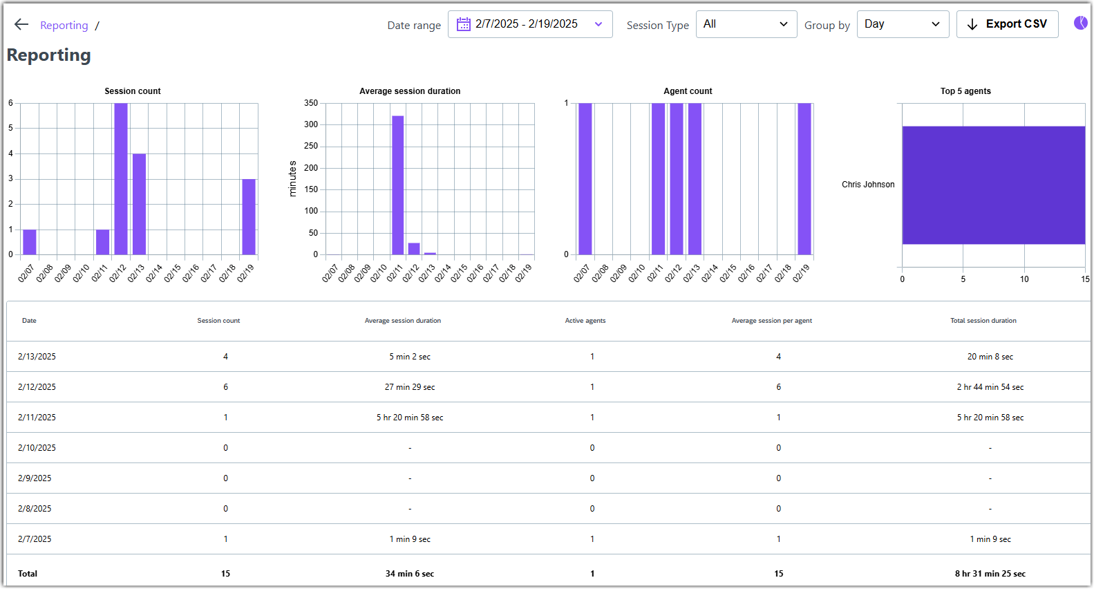 - Rapport de session : Fournit des détails sur les sessions d'assistance à distance de vos agents.