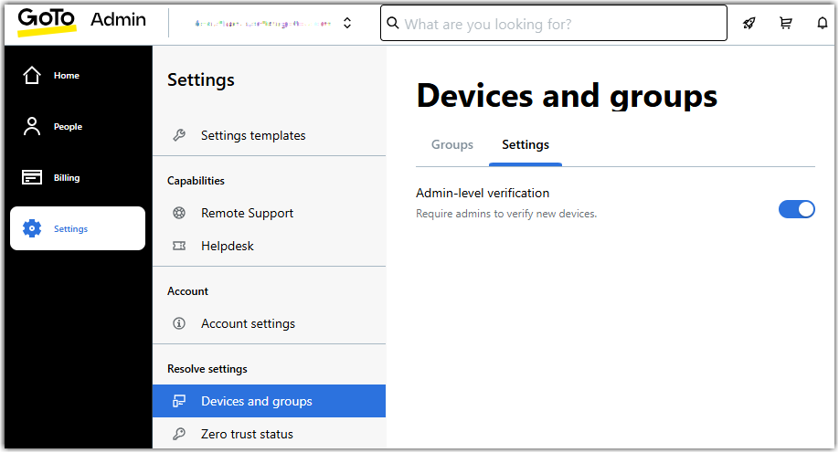 Tip: Si la vérification au niveau de l'administrateur est activée sur votre compte, les agents peuvent ajouter de nouveaux appareils, mais seuls les administrateurs peuvent les vérifier. Pour trouver ce paramètre dans GoTo Admin, allez dans et naviguez jusqu'à l'onglet Paramètres.