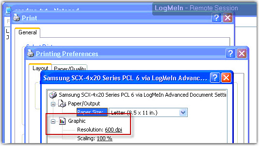 - Assicurati che la stampante client sia selezionata nella Stampa finestra di dialogo [Nome stampante] tramite LogMeIn[Printer Name] via RemotelyAnywhere.