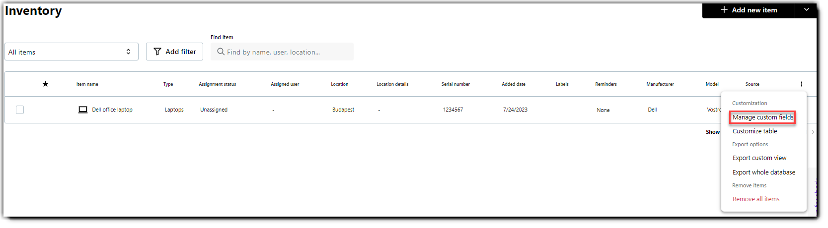 - Selecteer het Tandwielpictogram aan de rechterkant en selecteer Aangepaste velden beheren in de lijst.
