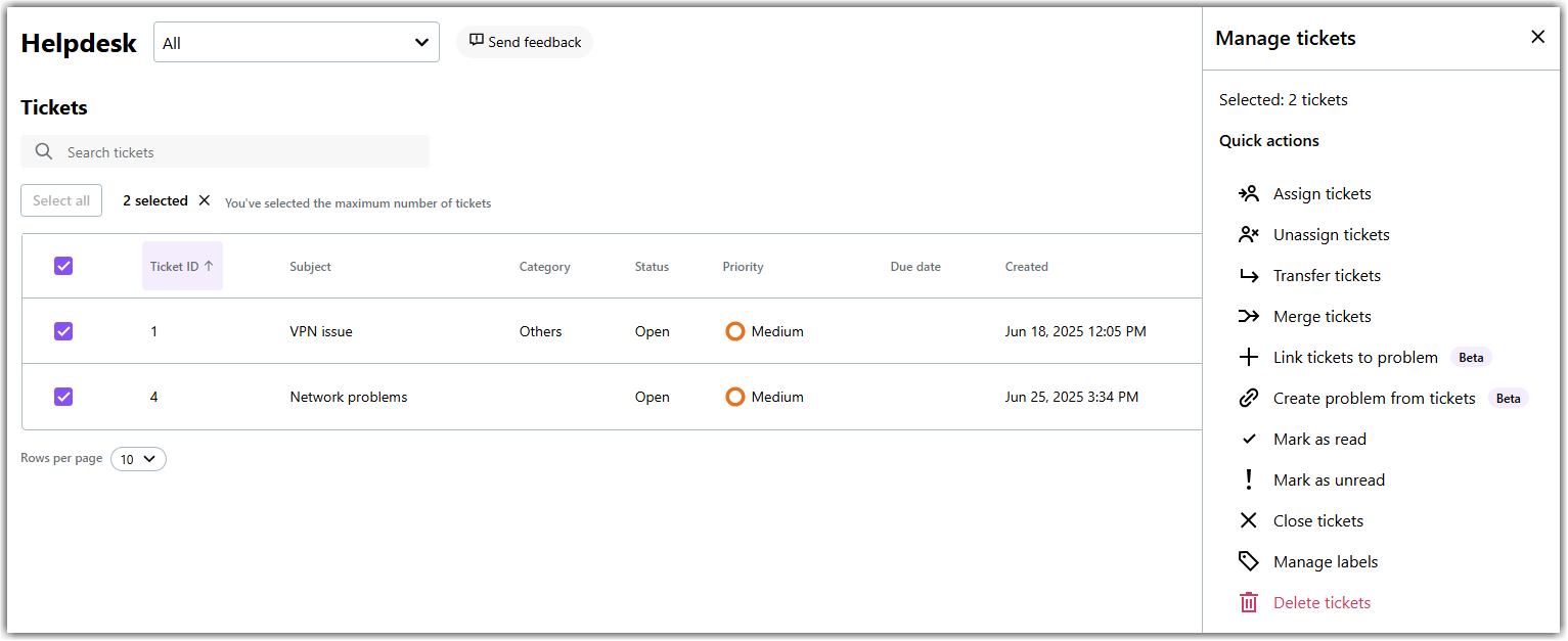 Je kunt meerdere Helpdesk tickets selecteren om ze samen te beheren.