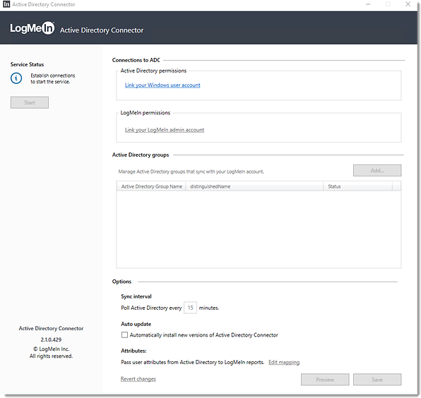 De Active Directory Connector (ADC) is een bureaubladtoepassing voor Windows die gebruikmaakt van een eenvoudige installatiewizard. Omdat het een Windows service is met een gebruikersinterface, moet je Windows beheerdersgegevens invoeren om de software te kunnen starten.