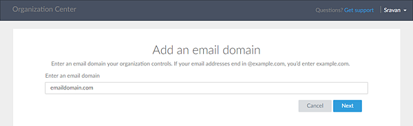 De eerste stap die je neemt bij het maken van een organisatie is het aanmaken van het initiële domein. Domeinen binnen uw organisatie zijn eigen e-maildomeinen die uw beheerders kunnen verifiëren via uw webservice of DNS-server. In de e-mail Joe@main.com is "main.com" bijvoorbeeld het e-maildomein. Door het initiële domein te verifiëren, wordt je organisatie automatisch aangemaakt. De gebruiker die de domeinverificatie voltooit, wordt automatisch een organisatiebeheerder, maar deze gebruiker hoeft geen GoTo productbeheerderrol te hebben. Je kunt ook meer domeinen toevoegen om te verifiëren of domeinen verwijderen die je niet meer in de lijst nodig hebt.