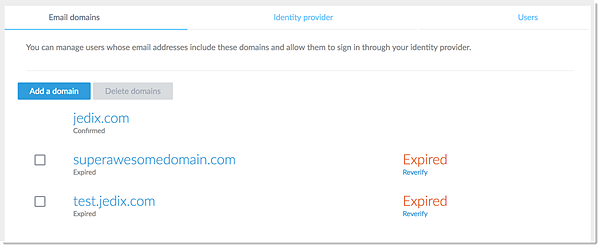 Zodra u het verificatieproces voor een domein start, hebt u tien (10) dagen de tijd om de verificatie te voltooien. Als deze periode verstrijkt, wordt het domein ingesteld op Verlopen, maar je hebt de optie om het proces eenvoudig opnieuw te starten met nieuwe verificatiecodes. Als je een domein eenmaal hebt geverifieerd, kun je het niet meer uit je organisatie verwijderen, maar het kan wel worden verwijderd voordat het is geverifieerd of nadat het is verlopen.