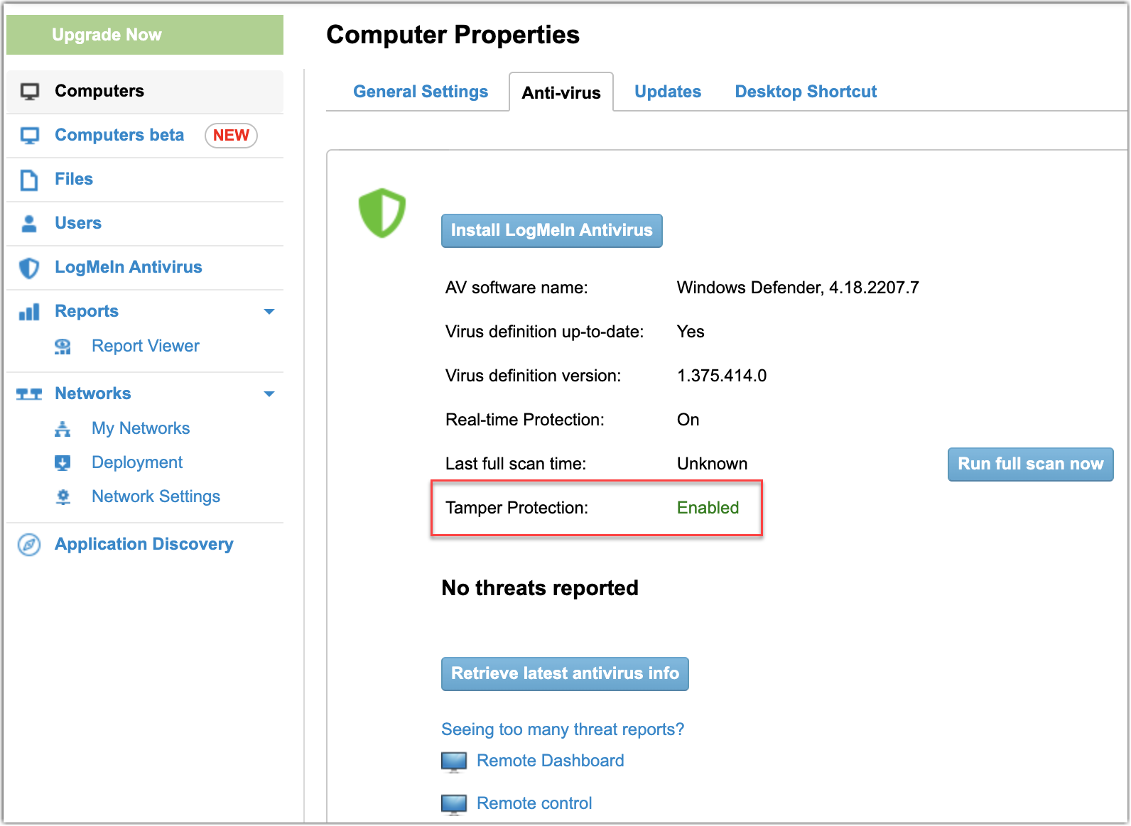 Tamper Protection is another built-in Windows feature that was designed to block third-party software, like LogMeIn Pro, from changing sensitive Windows system settings, such as the host's antivirus settings. When tamper protection is enabled on a Windows host, you cannot use LogMeIn Pro to manage the host's bult-in antivirus software, that is, Windows real-time protection.