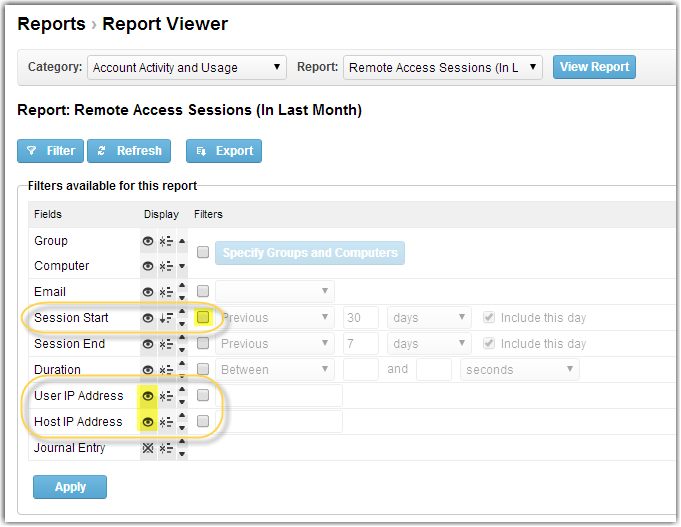 This report lists all of the occasions when your account was logged into. The default report includes the user, the user's IP address, and the time the account logged in (login start). This report answers the question "When was my account logged into?" The report is available to both LogMeIn Central and LogMeIn Pro users. |