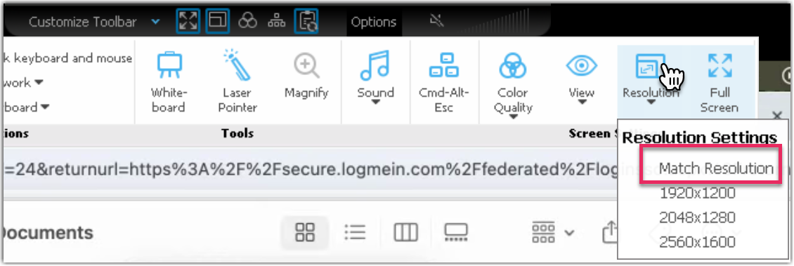Tip: Para obter melhores resultados durante a visualização da tela cheia, acesse e selecione Correspondência de resolução. Se a tela do controle remoto aparecer com uma borda preta em vez de tela cheia, mude para uma tela diferentesolution.