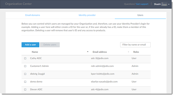 Você pode adicionar, excluire atualize os usuários da organização. Se o usuário já tiver uma ID de conta (uma conta para LogMeIn Centrals, por exemplo), você ainda deve adicioná-los à organização. Ele pode, então, autenticar por meio de seu IdP e, como sua ID é uma ID de empresa, não pode mais mudar seu endereço de e-mail. Se não tiverem um login de conta de produto, eles serão provisionados com um, mas não estará associado a um produto específico, a menos que você tenha configurado seu sistema para fazer isso por meio de um serviço de provisionamento de usuário , .