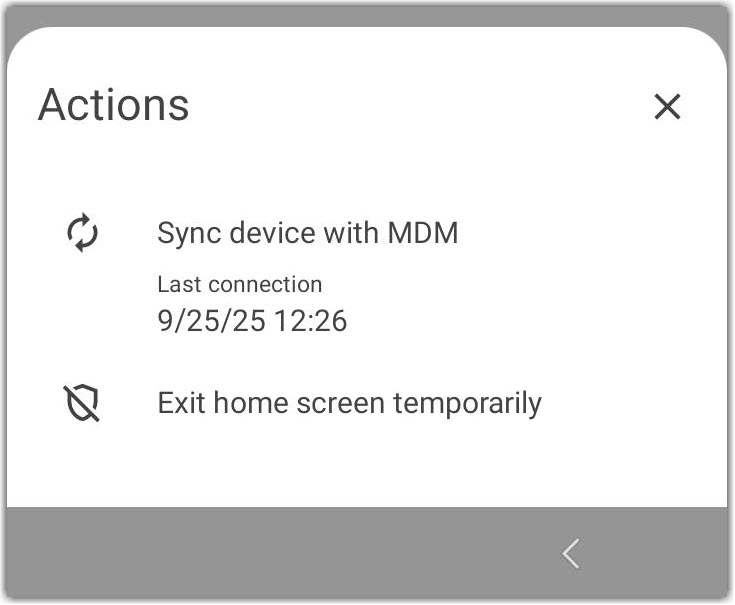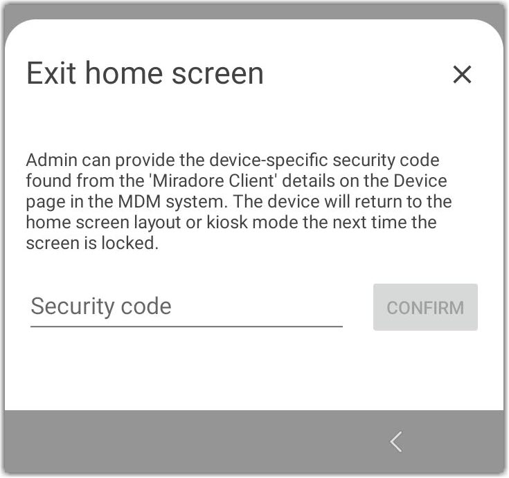 Results: The Miradore client overlay is enabled on the device and the device user can exit kiosk mode temporarily. This setting remains active on the device until the Allow users to exit kiosk mode temporarily setting is disabled in the configuration profile and the configuration profile is deployed to the device again.
