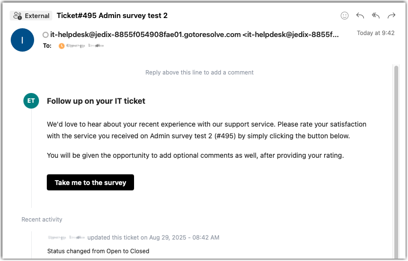 As an admin, you can add a link to an external survey. When a ticket is closed, the survey is automatically included in the email notification sent to the user who submitted the ticket.
