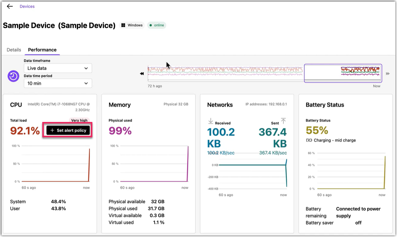 You can create alerts monitoring the performance of Windows devices while you’re monitoring your endpoint's health. When you notice high CPU utilization, either at the present moment or in historical data, you can proactively monitor these levels by creating alerts with prefilled policy details.